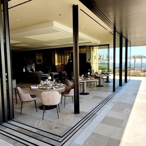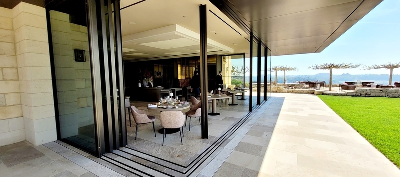 Cette réponse technique devient une véritable signature esthétique. Le Turnable Corner efface les limites entre intérieur et extérieur. Le lieu Les Belles Perdrix devient alors un restaurant à ciel ouvert.