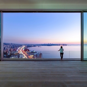 La tour est entieremnt équipé avec les baies vitrées coulissantes minimalistes Vitrocsa Gamme TH+ 44 avec rails invisibles sur 2 lignes sous Brevet Mondial Vitrocsa.