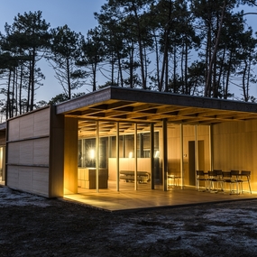 Un abri pour vivre et circuler dans la pinède » avec cette maison familiale de 250m2, Nicolas Dahan signe un espace limpide au service du paysage et une discrète performance d’ingénierie appliquée au bois. Le sol et le plafond aux dimensions rigoureusement identiques impriment un effet miroir qui brise tout idée de hiérarchie ; le regard glisse entre les pins et les perspectives intérieures, le pied passe sans heurt du sable chaud au plancher souple d’okoumé.